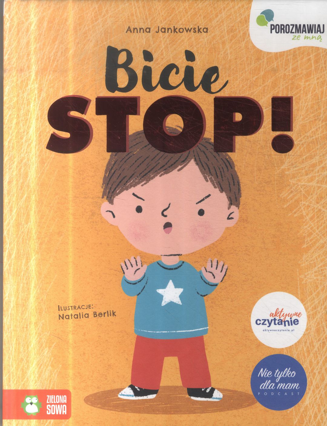 Książka powstała z myślą o dzieciach, którym zdarza się bić innych w złości, i tym, które nie wiedzą, jak reagować, gdy ktoś je atakuje (bije, szczypie, wyrywa zabawki). Opisywane w niej sytuacje mogą mieć miejsce zarówno w przedszkolu czy na placu zabaw, jak i w domu (między rodzeństwem). Publikacja zawiera instruktażowe porady – dla dzieci i rodziców, radzenia sobie ze złością w konkretnych sytuacjach. „Bicie STOP!” to tytuł, który rozpoczyna serię „Porozmawiaj ze mną” autorstwa Anny Jankowskiej, znanej między innymi z internetowej grupy FB Aktywne czytanie. DR ALEKSANDRA PIOTROWSKA POLECA: Kto z nas nie doświadczył problemu ze złoszczącym się kilkulatkiem? Ta książka pokazuje dzieciom, w jaki sposób mogą sobie poradzić ze swoją złością czy zazdrością bez krzywdzenia innych. Bo główne jej przesłanie zawiera się w powtarzanym jak mantra apelu „BICIE STOP – BICIE BOLI”. Co bardzo ważne: autorka nie wmawia dzieciom, że brzydko czy niegrzecznie jest się złościć – zamiast tego uświadamia (i to na przykładach konkretnych sytuacji), jak dziecko może SAMO poradzić sobie ze złością, co może zrobić ZAMIAST bicia innych. Anna Jankowska ma rację – złość to pełnoprawne, potrzebne nam w życiu uczucie, ale już nieduże dzieci trzeba uczyć, jak wyrażać je bez używania pięści. I w tej nauce ta książka może bardzo pomóc.